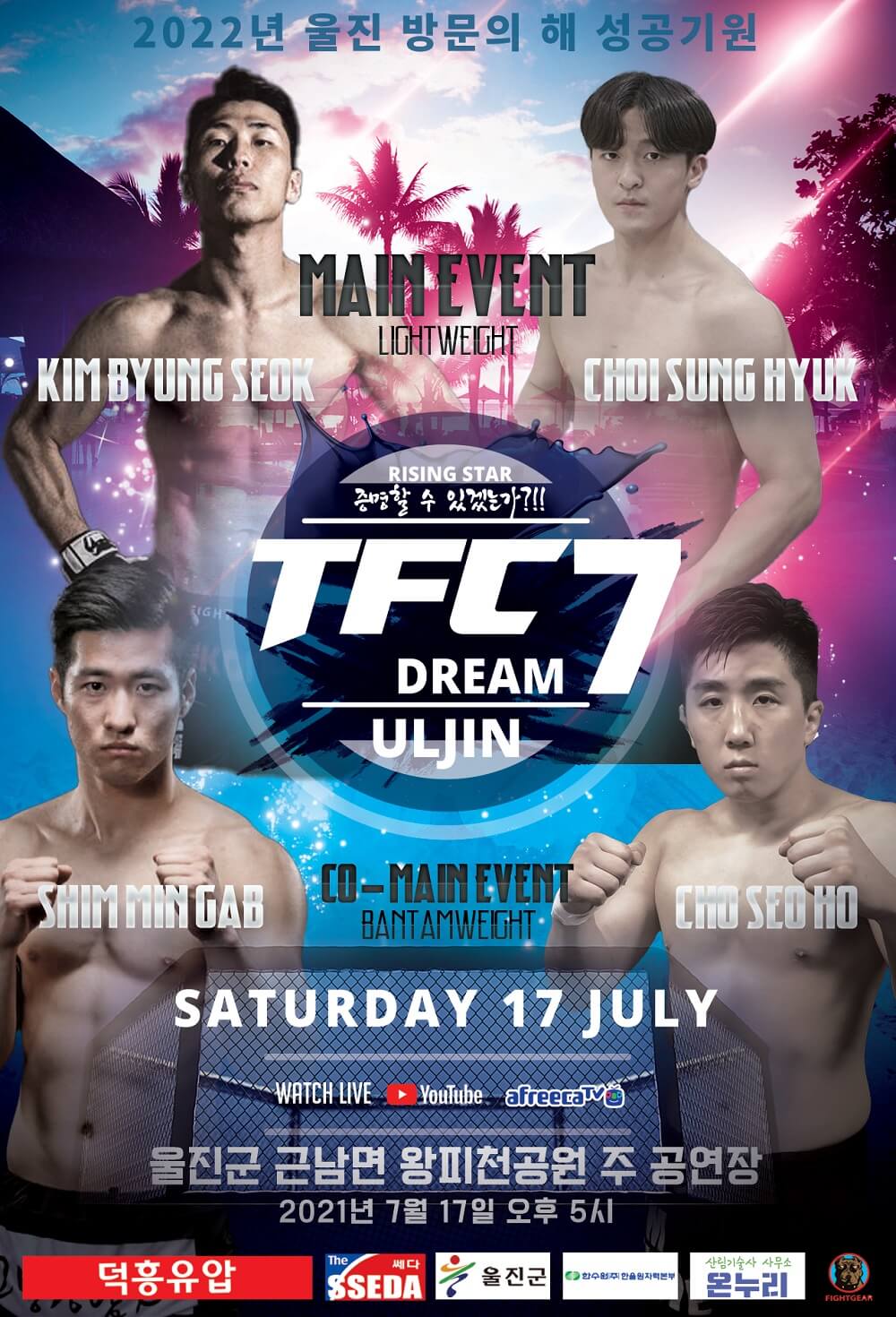 TFC는 "박지원(37, 울진 팀 K)과 조정환(29, 대구 아톰 짐)이 'TFC 드림 7' 언더카드에서 웰터급 경기를 갖는다"라고 공식 발표했다. 둘 모두 프로 데뷔전이다.