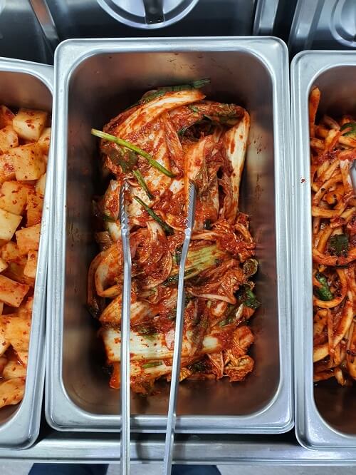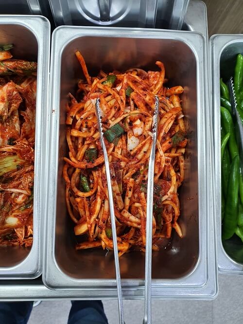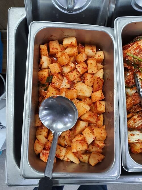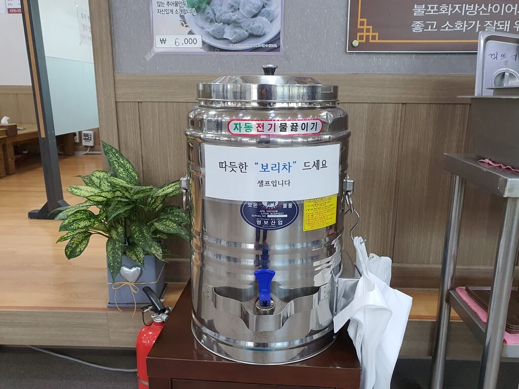 셀프 코너에 김치, 깍두기, 도라지 무침, 아삭이 고추&청양고추가 있어 부족한 반찬은 가져다 드시면 됩니다. 셀프코너 옆에 따뜻한 보리차도 있어요. 겨울 철이라 따뜻한 보리차 드시는 분들도 많이 계시더라고요.