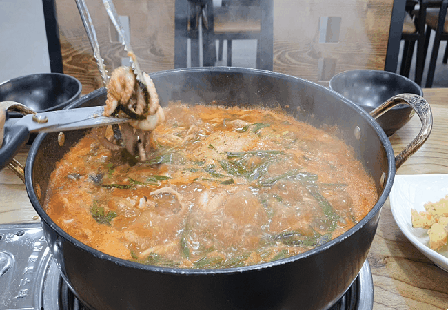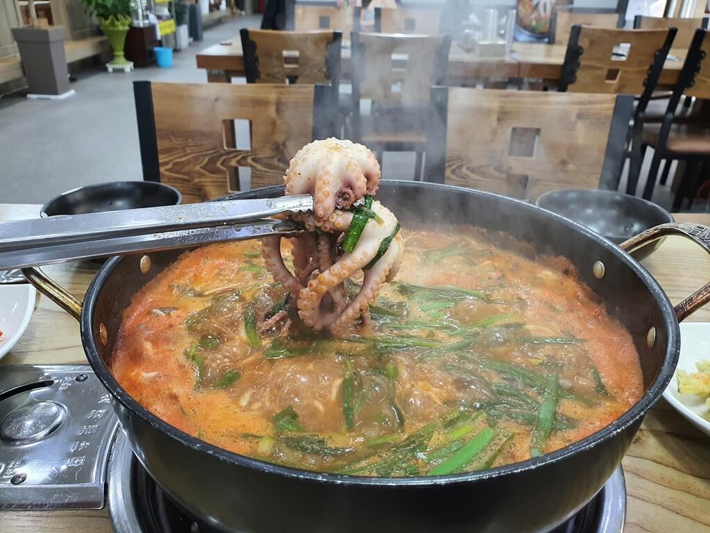 기본 추어 장칼국수에 낙지가 추가된 낙지 장칼국수입니다. 추어 장칼국수보다 낙지를 넣으면 국물이 한결 시원하고 맛이 좋습니다.