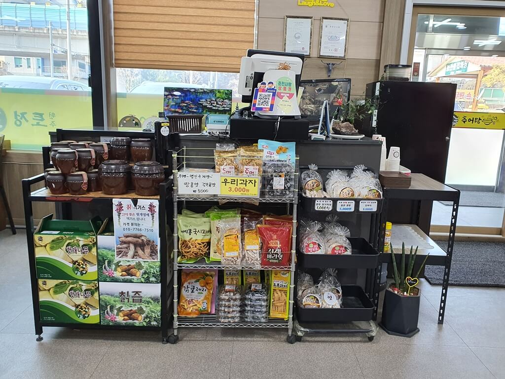 카운터 앞에는 각종 과장류와 헛개나무즙, 칡즙, 도라지청, 토정 추어탕에서 직접 담은 고추장, 된장, 조선간장 등을 판매하더라고요. 이상 춘천 토정추어탕, '낙지 장칼국수' 먹어본 후기였습니다.