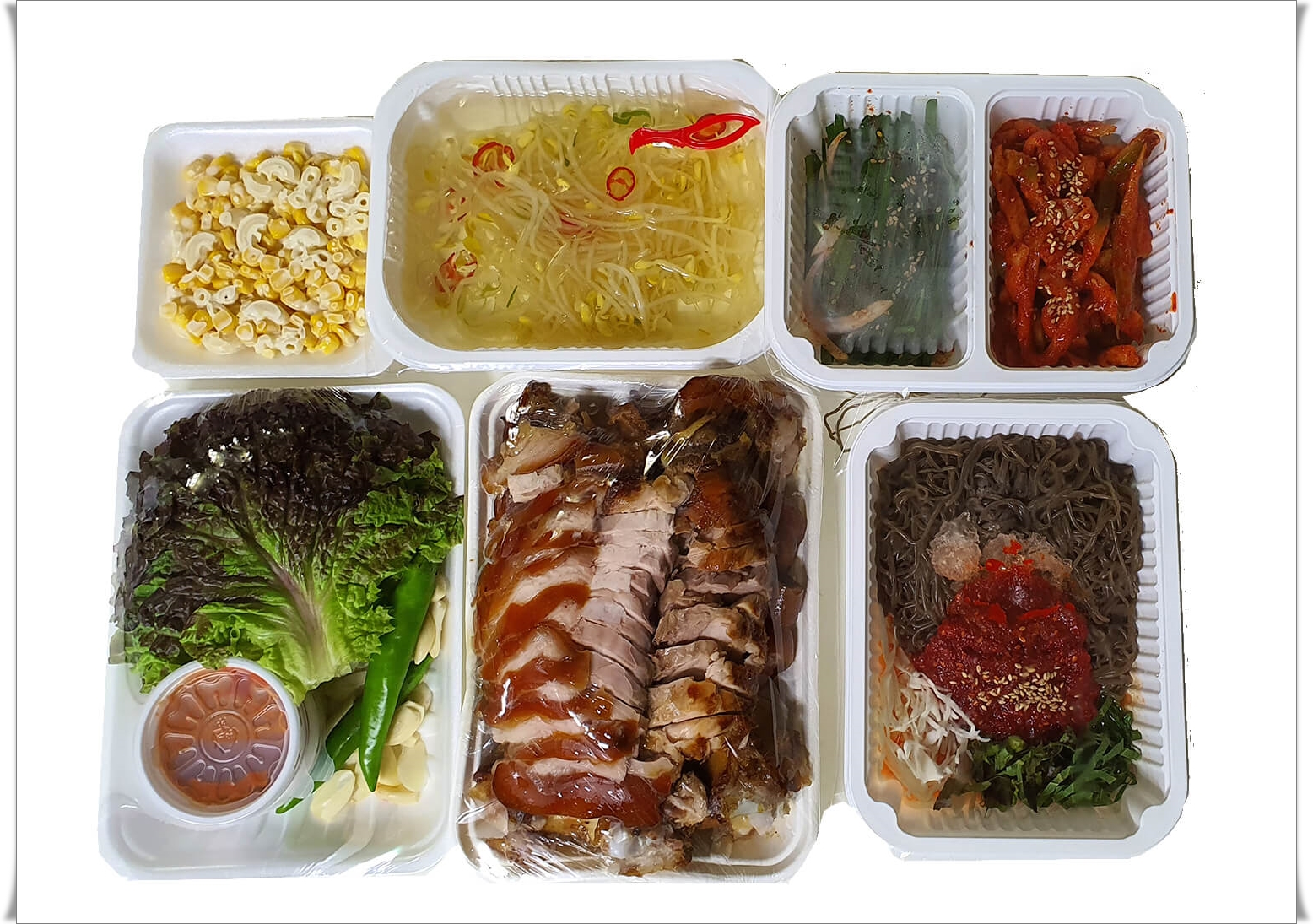 기본 구성으로 막국수+쌈채소(상추, 마늘, 고추, 새우젓, 쌈장)+콘샐러드+