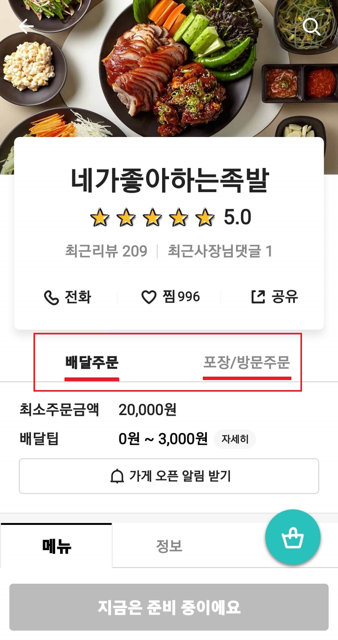 족발 주문하실 때 배달 주문인지 포장/방문 주문인지