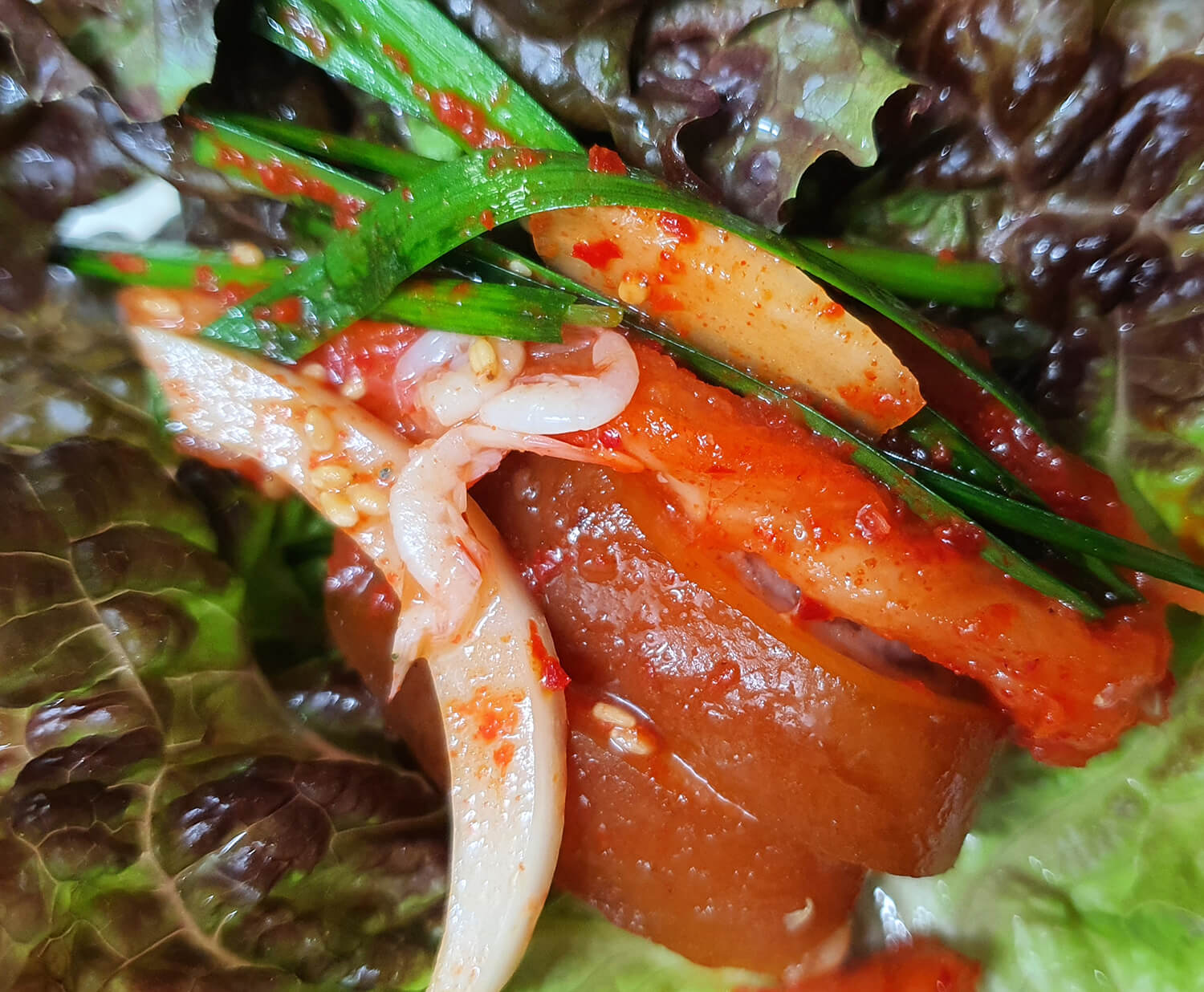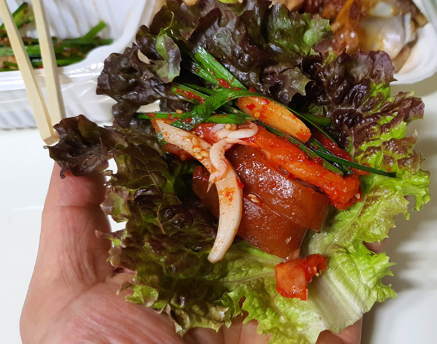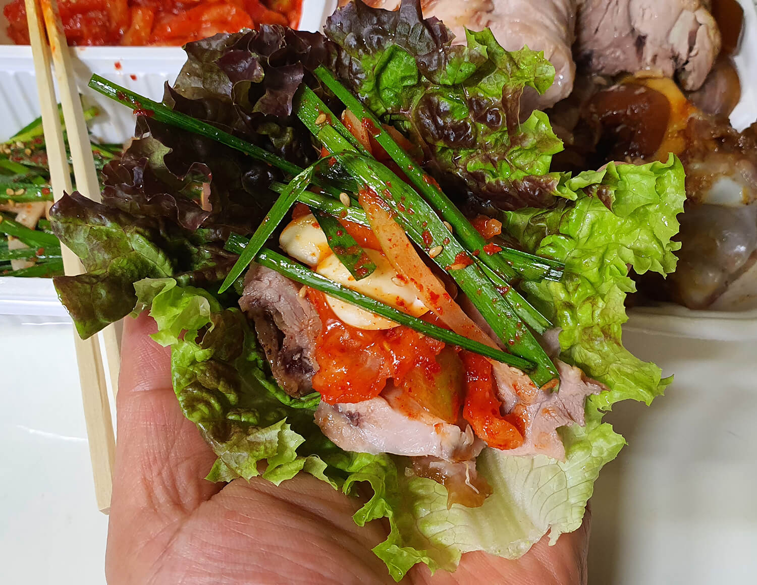 상추에 족발을 올리고 마늘과 무절임 김치, 부추 무침을 올려