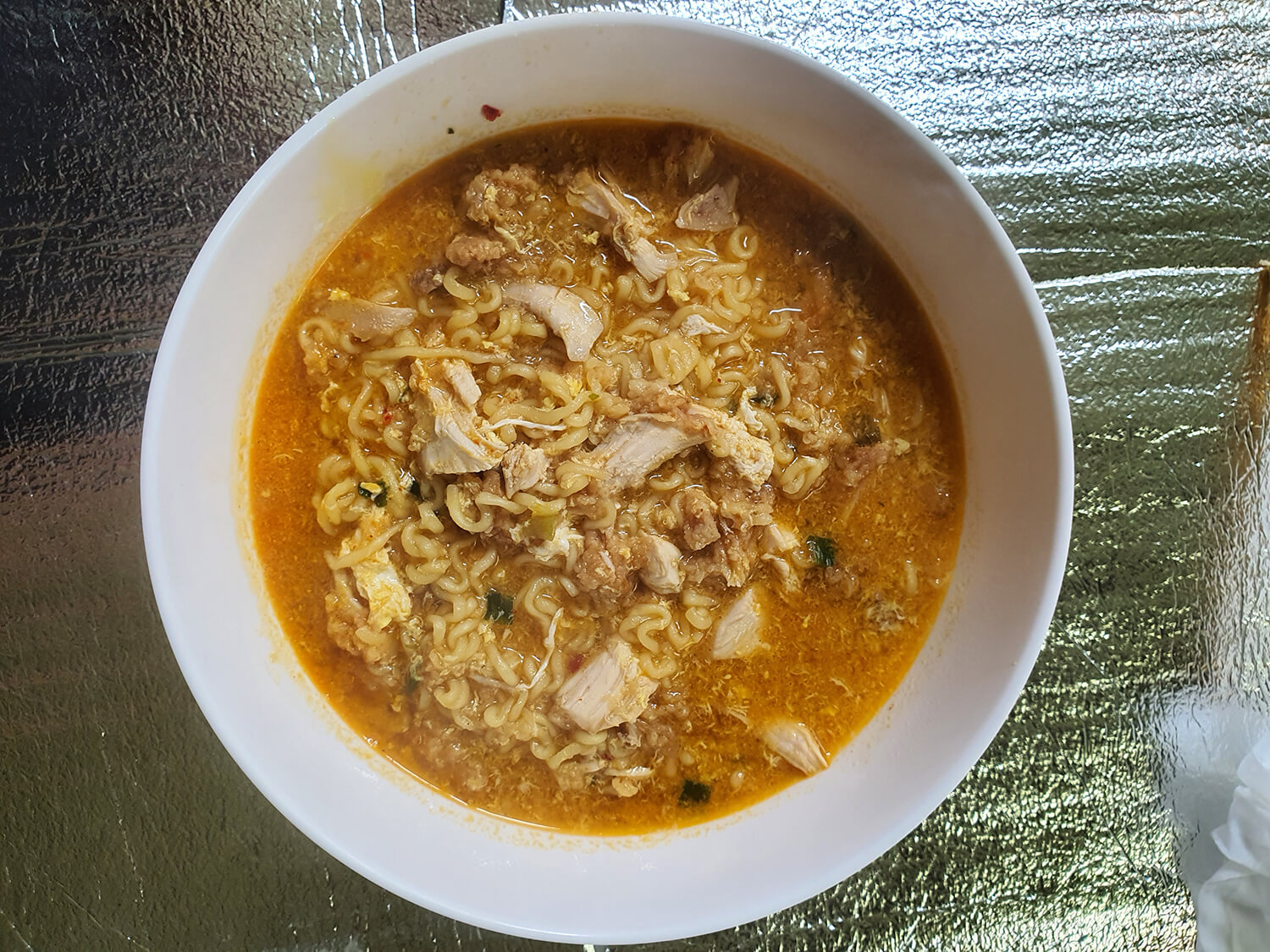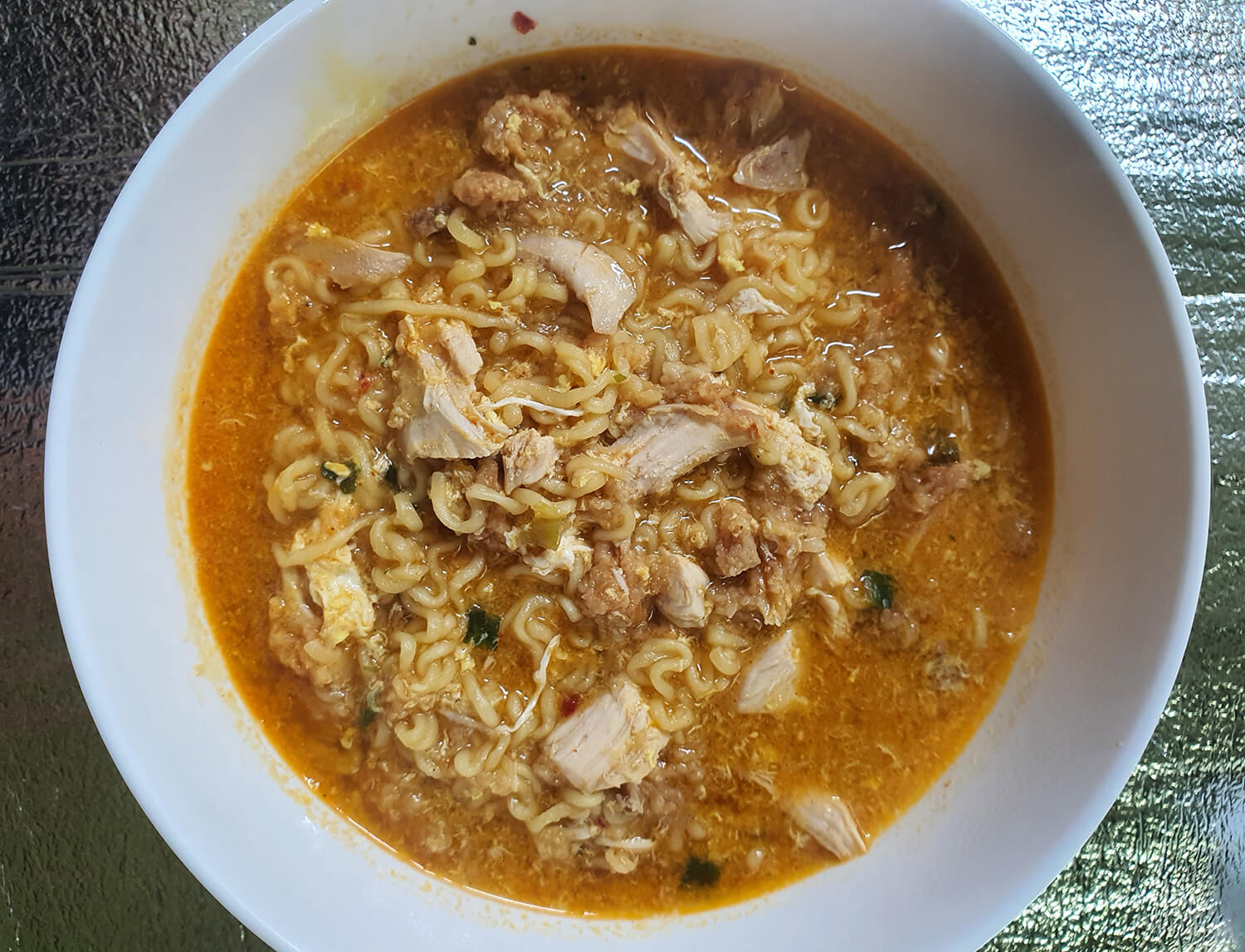 라면 스프를 넣은 후 전날 먹다 남은 후라이드 치킨을 잘 게 찢어 넣어 한손끔 끓여줍니다.