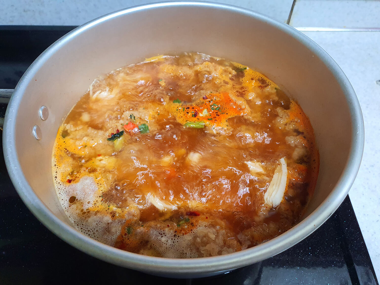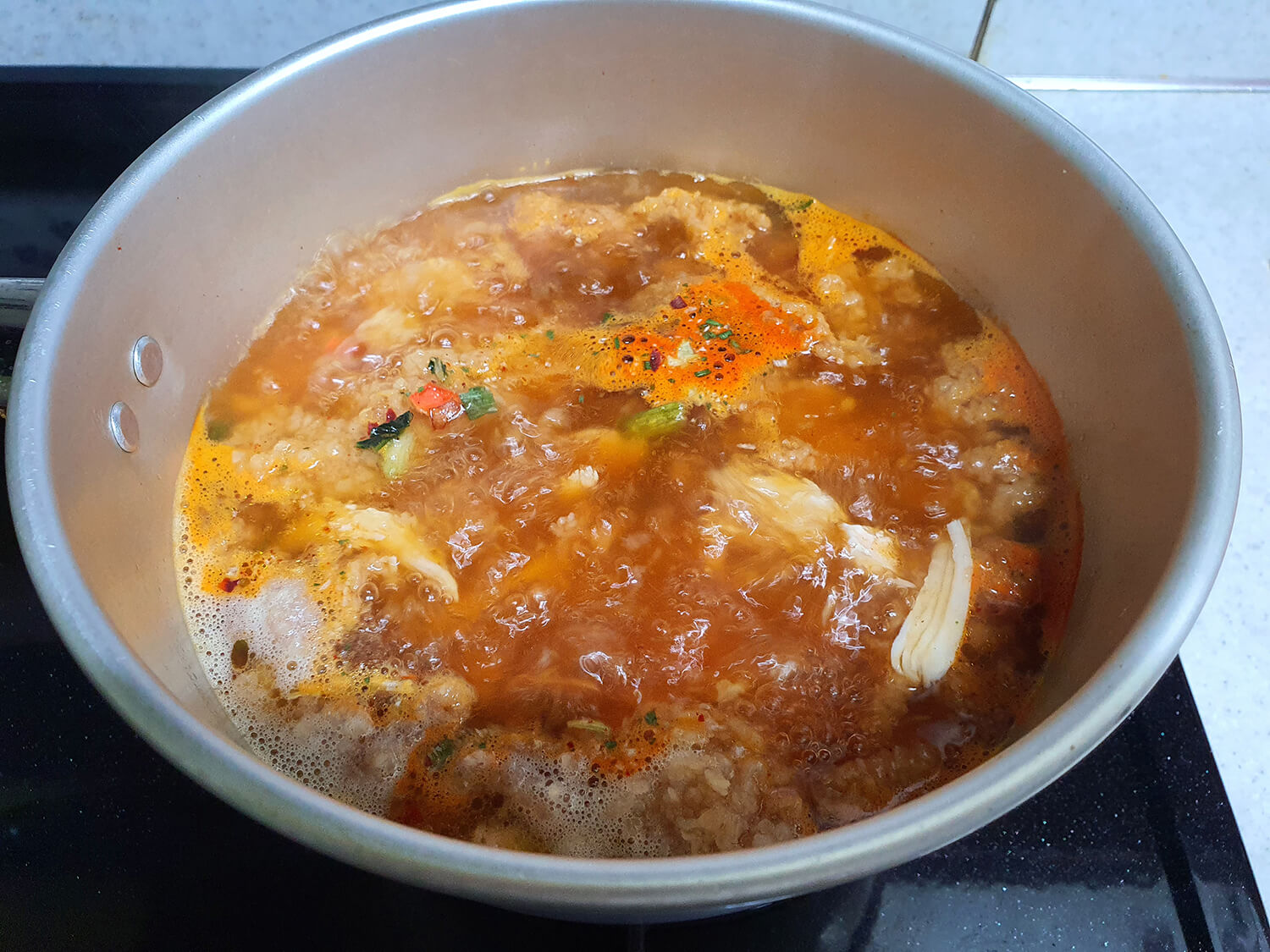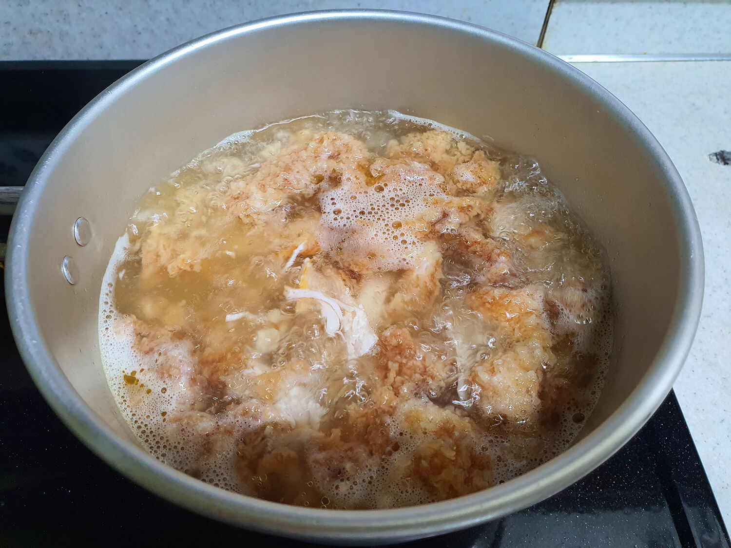 후라이드 치킨을 라면 스프와 한소끔 끓인 후