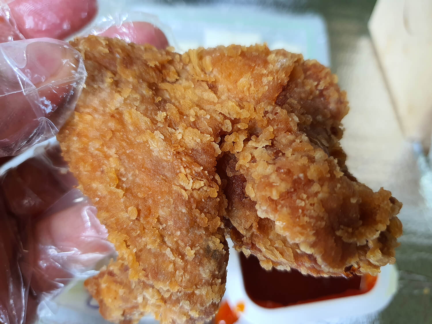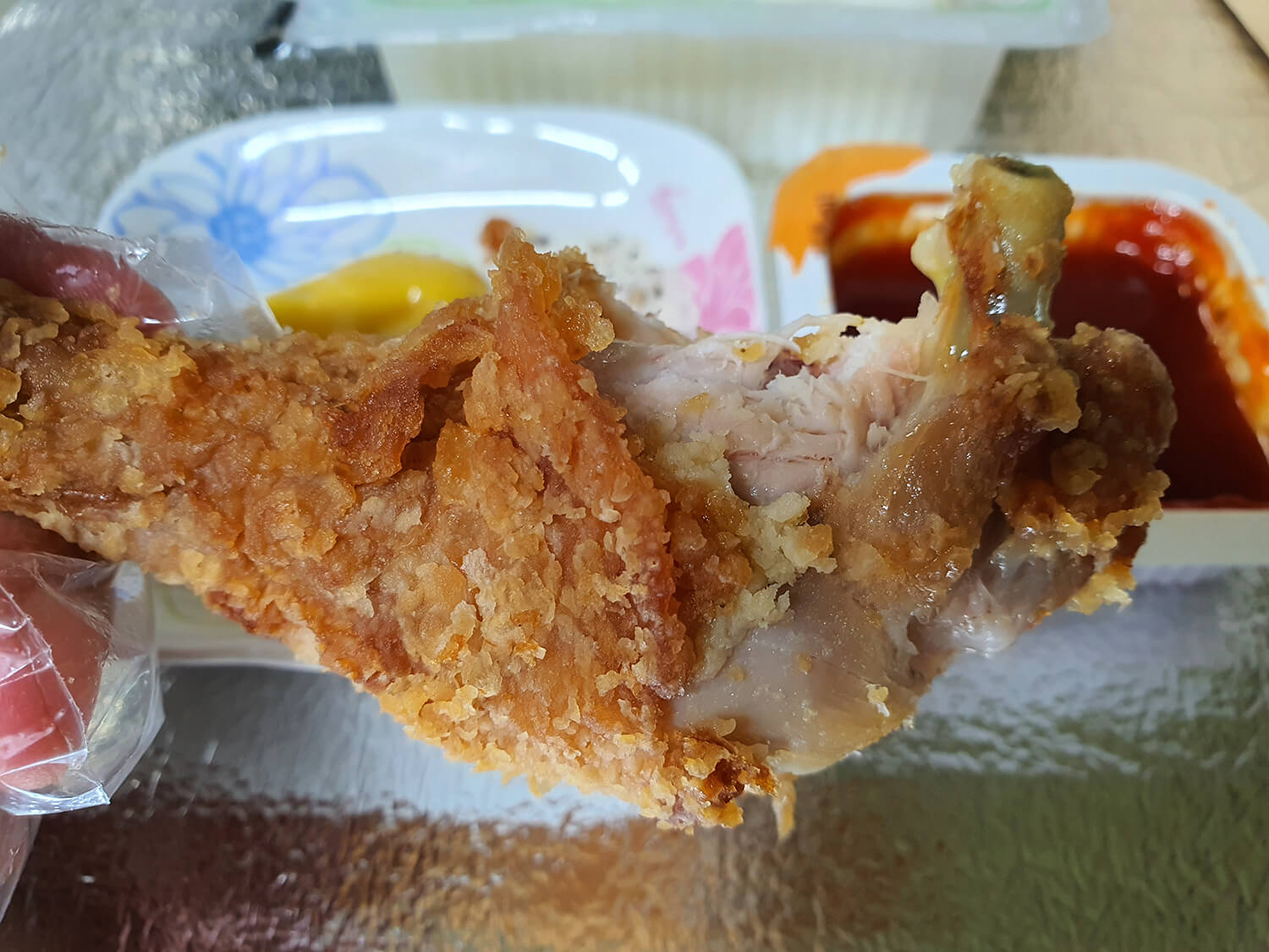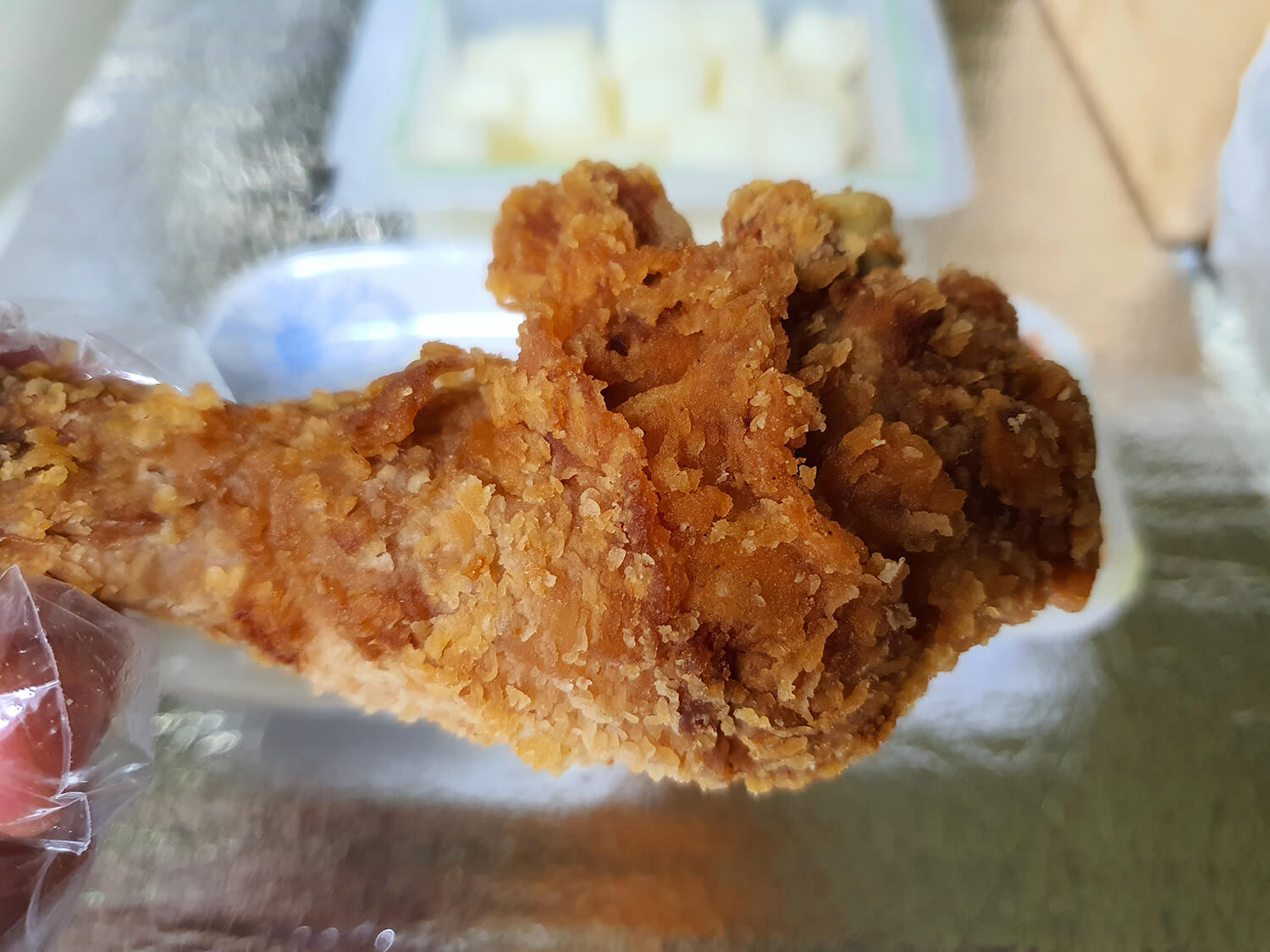 오동통한 우동치 후라이드 치킨 닭다리를 한입 먹으니 매콤하고