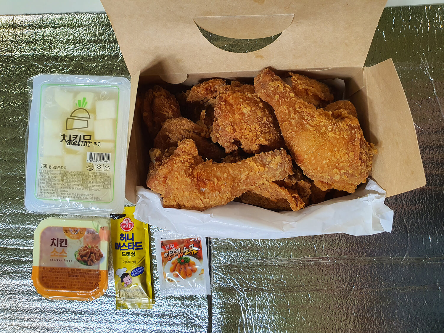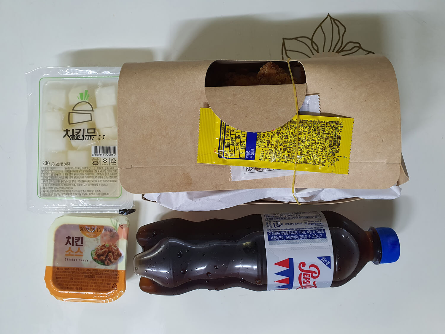 후라이드 치킨과 콜라, 치킨무, 치킨 소스, 허니 머스터드소스, 양념소금 등...