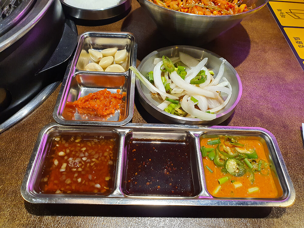 기본 상차림으로 3가지 소스와 된장 마늘과 양파, 매콤 아삭한 콩나물 무침, 파스타, 계란찜 와이프가 만들어준 파와 청양고추를 듬뿍 넣은 쌈장소스입니다.