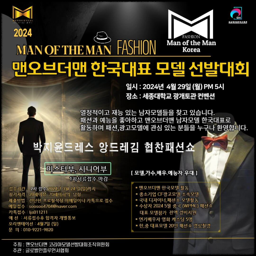 국내 최고의 남자 미스터 모델 시니어 모델 선발대회로 맨오브더맨 코리아모델선발대회 조직위원회가 주최하고 글로벌인플루언서협회가 주관하는 남성 최고의 모델선발대회입니다.